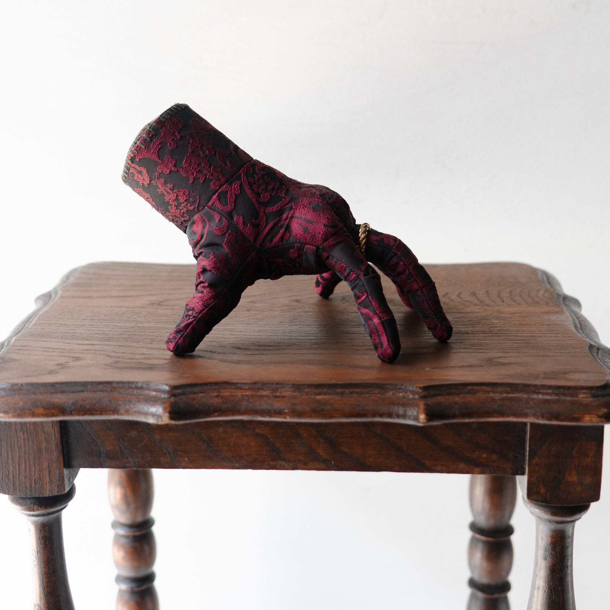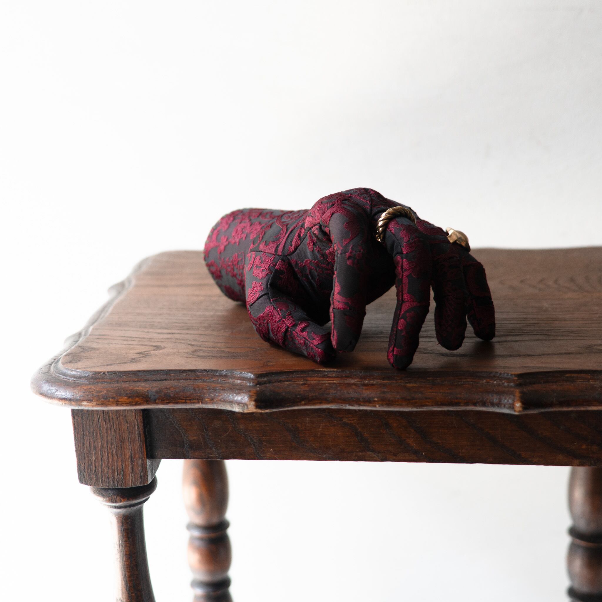 石膏型のように緻密な手の造形は無数のダーツで表現されており