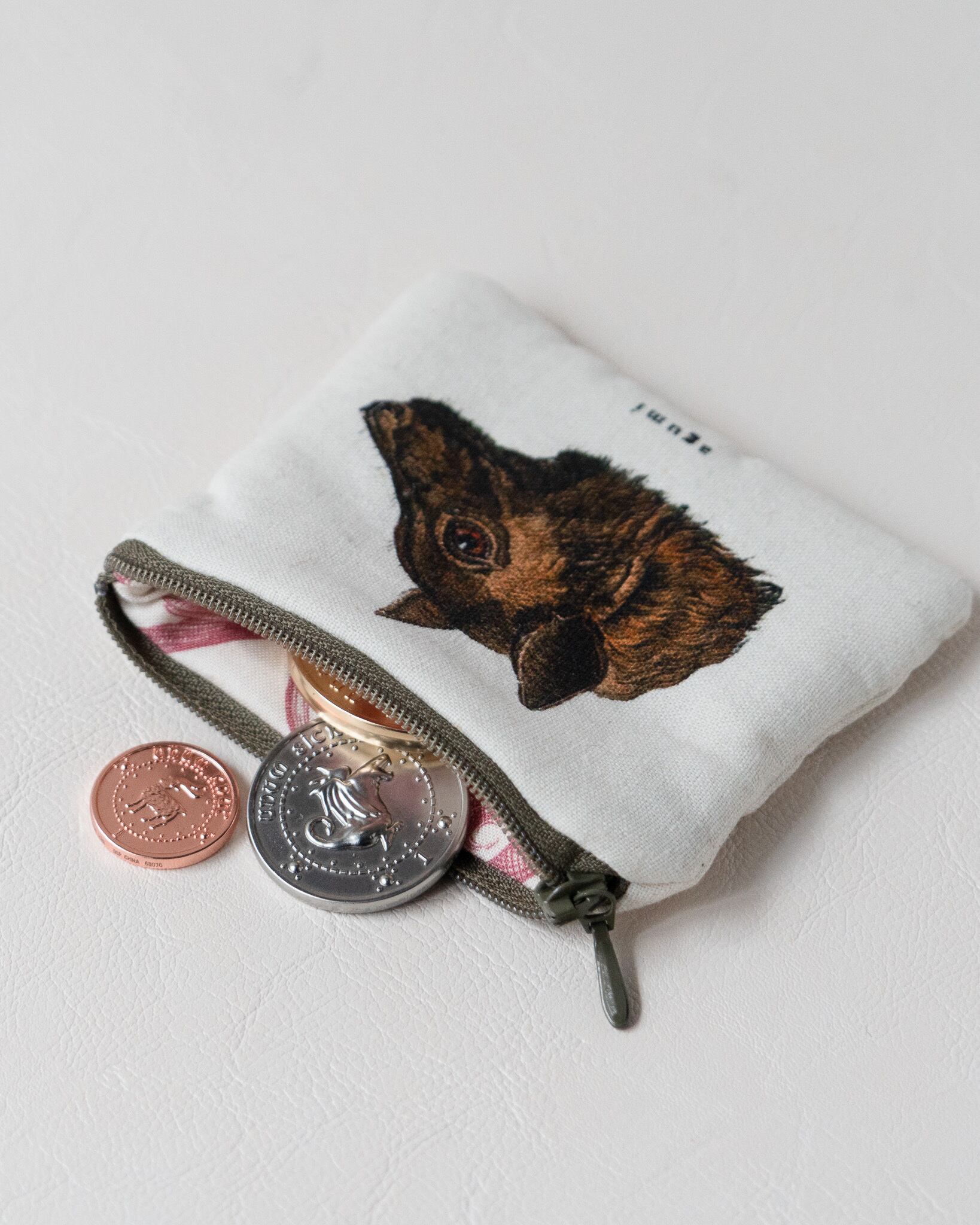 アンティークのコウモリのイラストをプリントしたポーチ。