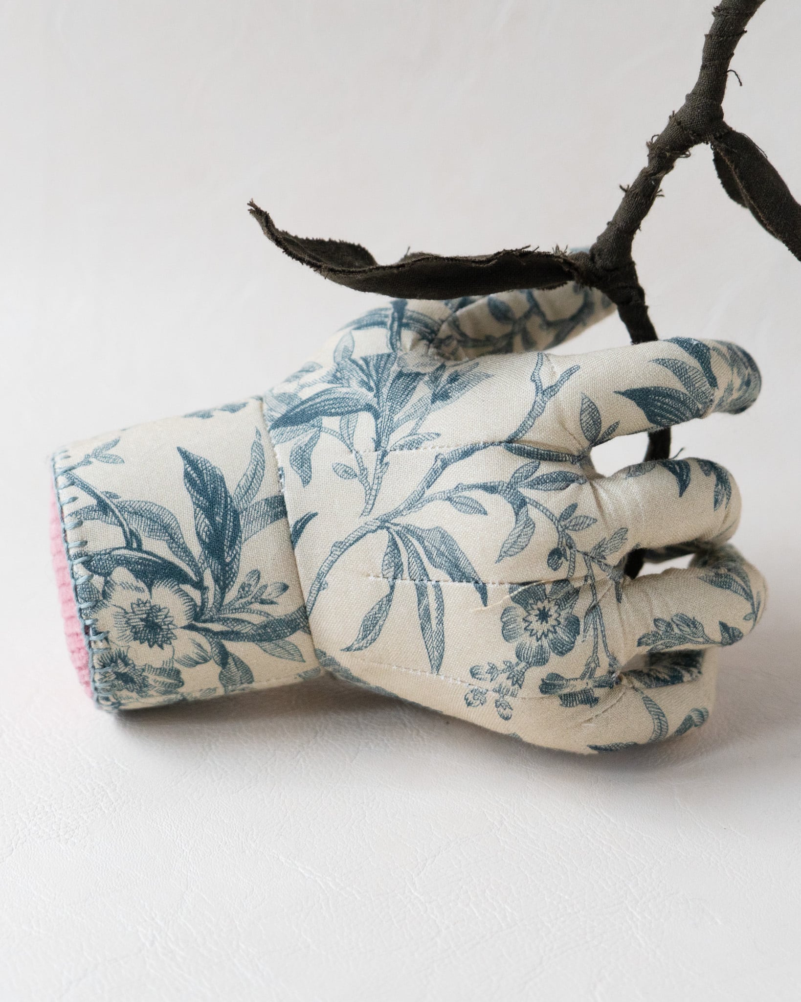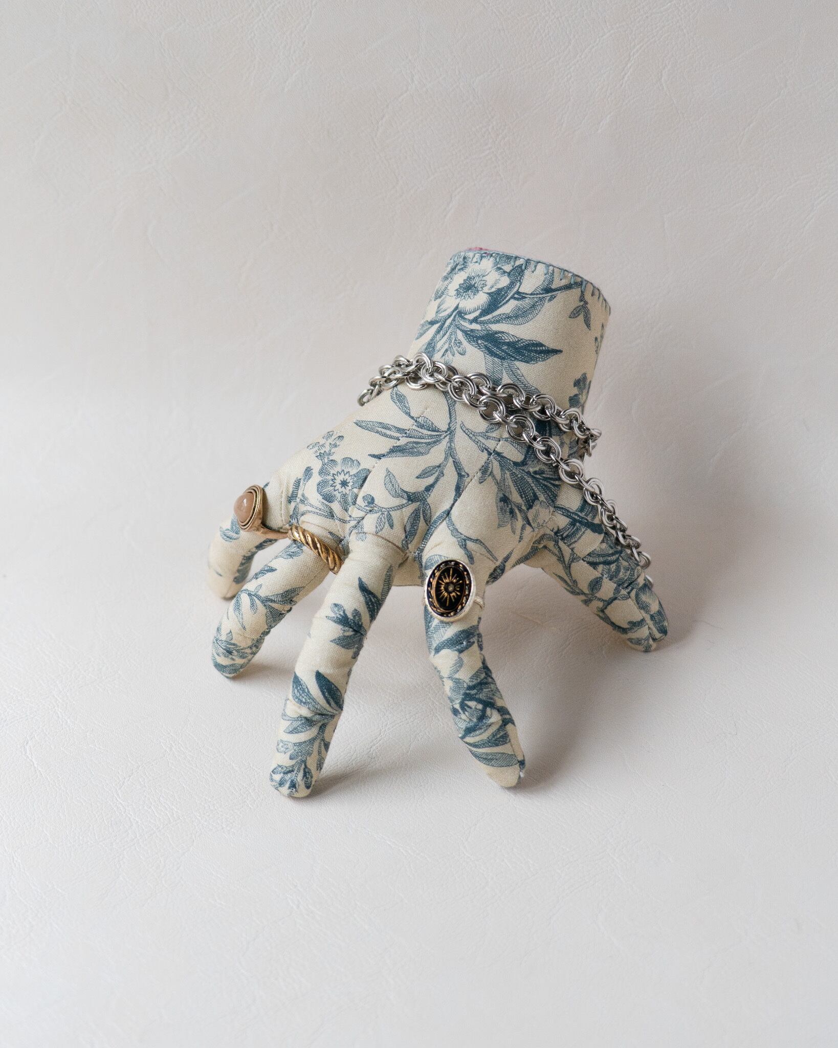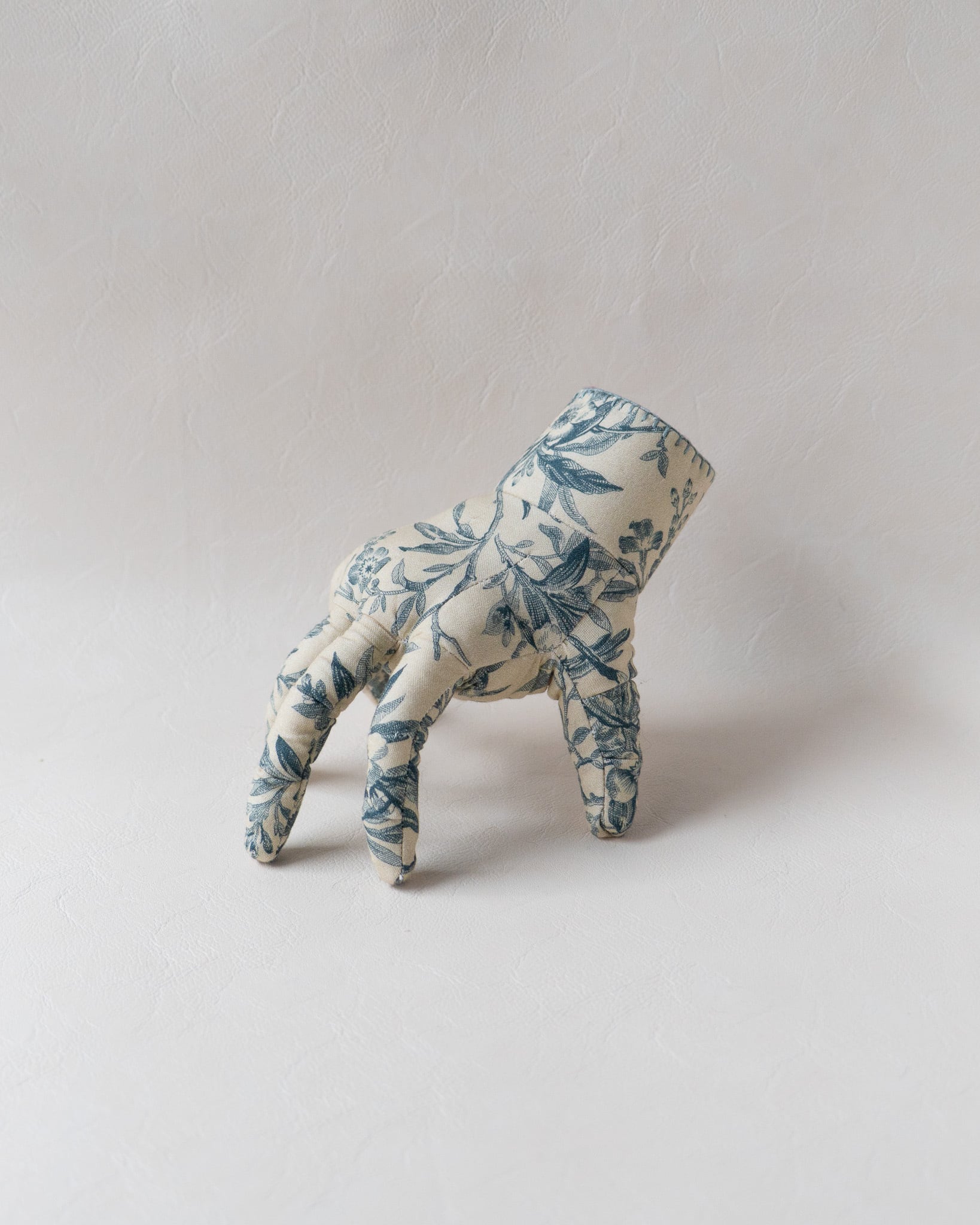 石膏型のように緻密な手の造形は無数のダーツで表現されており